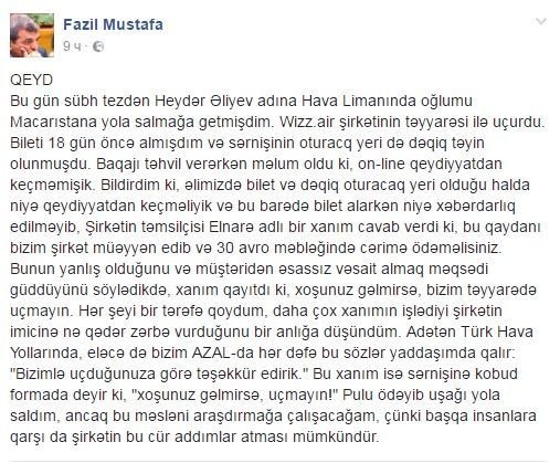 Oğlu "Wizz Air” şirkətinin təyyarəsi ilə uçmalı imiş: "Bileti 18 gün öncə almışdım və sərnişinin oturacaq yeri də dəqiq təyin olunmuşdu. Baqajı təhvil verərkən məlum oldu ki, onlayn qeydiyyatdan keçməmişik. Bildirdim ki, əlimizdə bilet və dəqiq oturacaq yeri olduğu halda, niyə qeydiyyatdan keçməliyik və bu barədə bilet alarkən niyə xəbərdarlıq edilməyib?