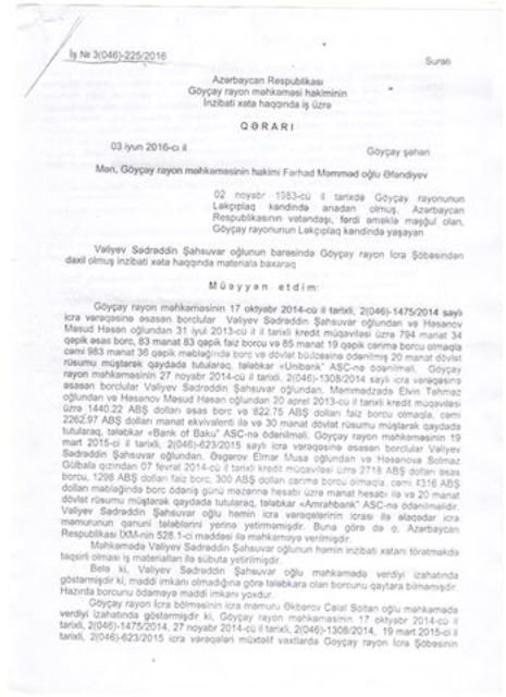 33 yaşlı vətəndaş Vəliyev Sədrəddin Şahsuvar oğlu Göyçay rayon məhkəməsinin hakimi Fərhad Əfəndiyevin qərarı ilə "Unibank”a 983,36 manat, "Bank of Baku” ya isə 4316 dollar məbləğində krediti ödəyə bilmədiyinə görə 3 iyunda 20 günlük həbs olunub.
