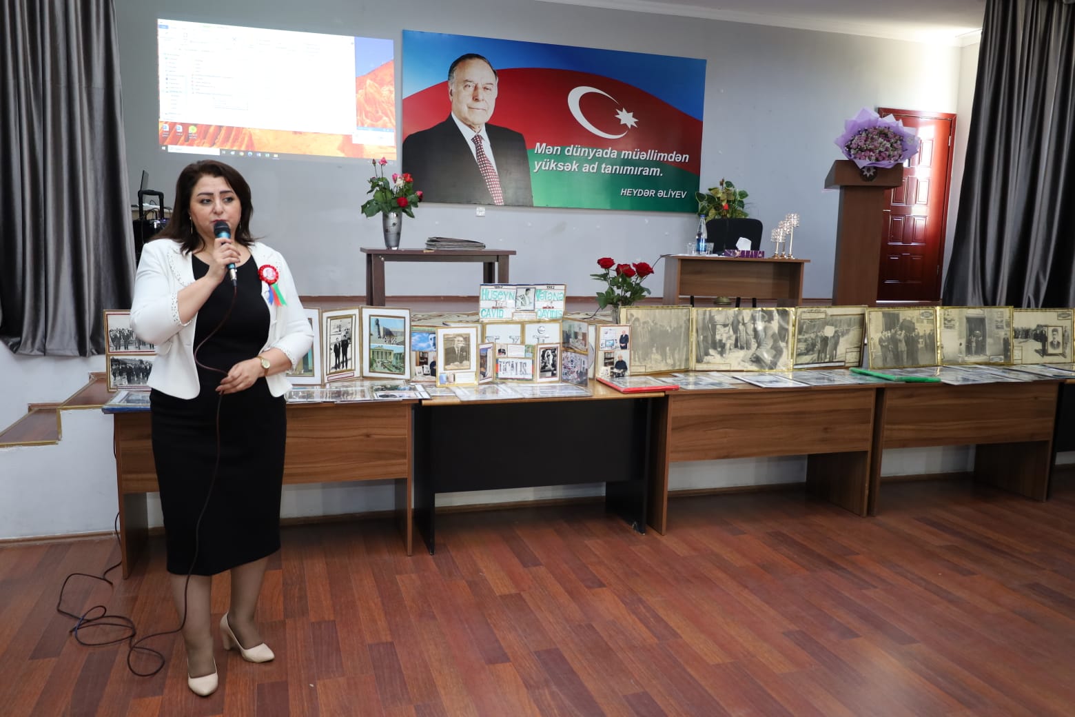 Tahirə xanım Heydər Əliyev şəxsiyyətindən söz açaraq, tədbirin mahiyyətini qeyd etdikdən sonra, sözü tədbirin təşəbbüskarı və təşkilatçısı olan, "Video-İnterneyşnl Prodüser” Mərkəzinin təsisçisi və Baş direktoru, AYB, AJB və AAB-nin üzvü, jurnalist, yazıçı-publisist Aygün Hacıyevaya verdi. Aygün xanım ilk əvvəl tədbirin həyata keçirilməsi üçün imkan yaradan Abşeron-Xızı Regional Təhsil İdarəsinin müdiri İlhamə xanım Abdullayevaya təşəkkürünü bildirdi. Daha sonra o, tədbirin yüksək səviyyədə keçirilməsi üçün əlindən gələni əsirgəməyən Tahirə xanıma, həmçinin Heydər Əliyevə həsr olunmuş sərginin təşkilində, gözəl səhnə tərtibatında... zəhməti keçənlərə; məktəbin direktoru başda olmaqla, pedaqoji kollektivə, texniki işçilərə minnətdarlıq etdi.