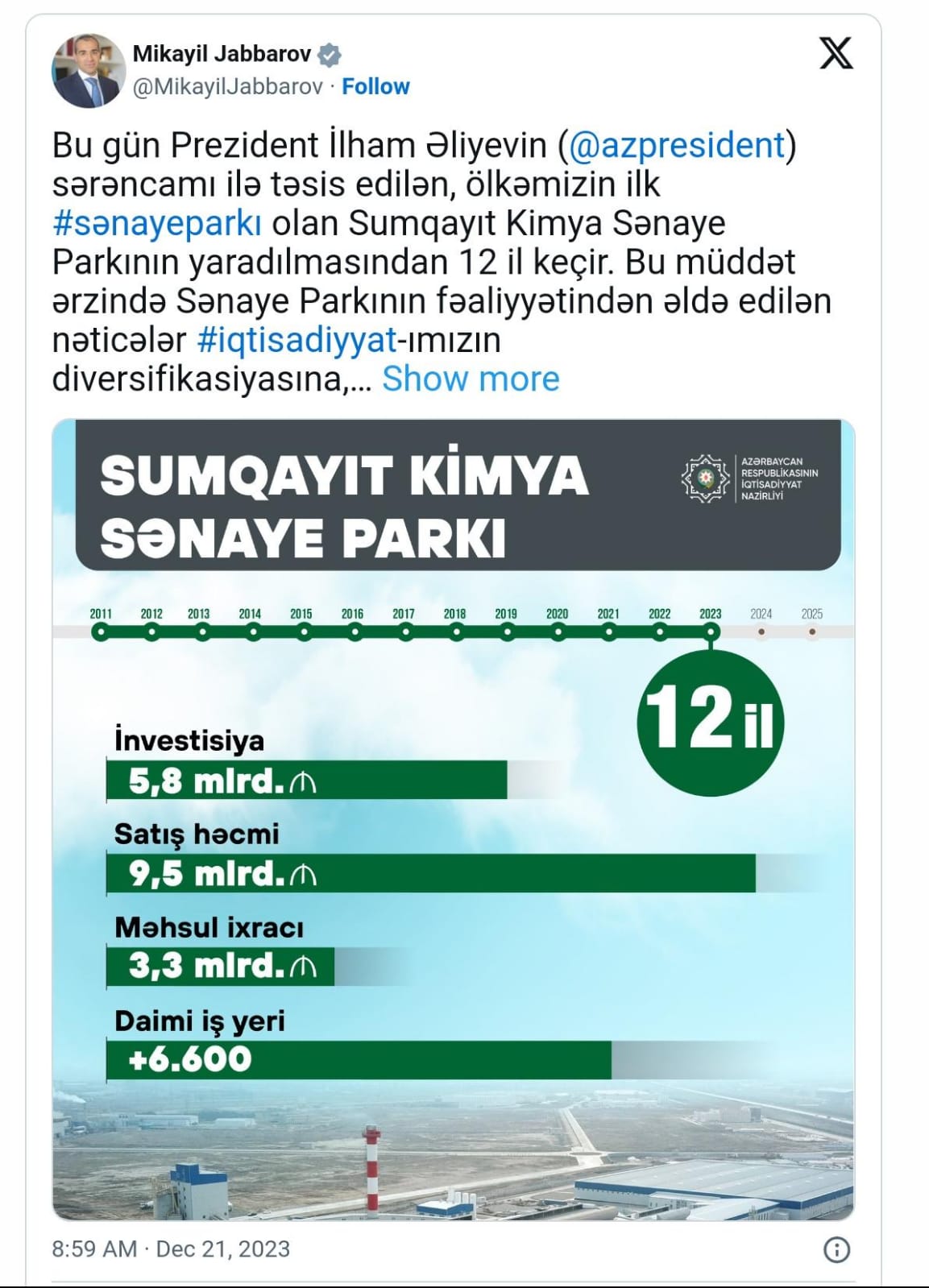 "Bu gün Prezident İlham Əliyevin sərəncamı ilə təsis edilmiş, ölkəmizin ilk sənaye parkı olan Sumqayıt Kimya Sənaye Parkının yaradılmasından 12 il keçir. Bu müddətdə Parkın fəaliyyətindən əldə edilən nəticələr iqtisadiyyatımızın diversifikasiyasına, qeyri-neft sektorunun inkişafına, məşğulluğun artırılmasına, innovativ istehsalın təşkilinə və idxaldan asılılığın azaldılmasına əhəmiyyətli töhfələr verib. Bu günə qədər Parka 5,8 milyard manata yaxın investisiya qoyulub, buradan 9,5 milyard manat dəyərində satış həyata keçirilib, 6 600-dən çox daimi iş yeri yaradılıb", - deyə o qeyd edib.