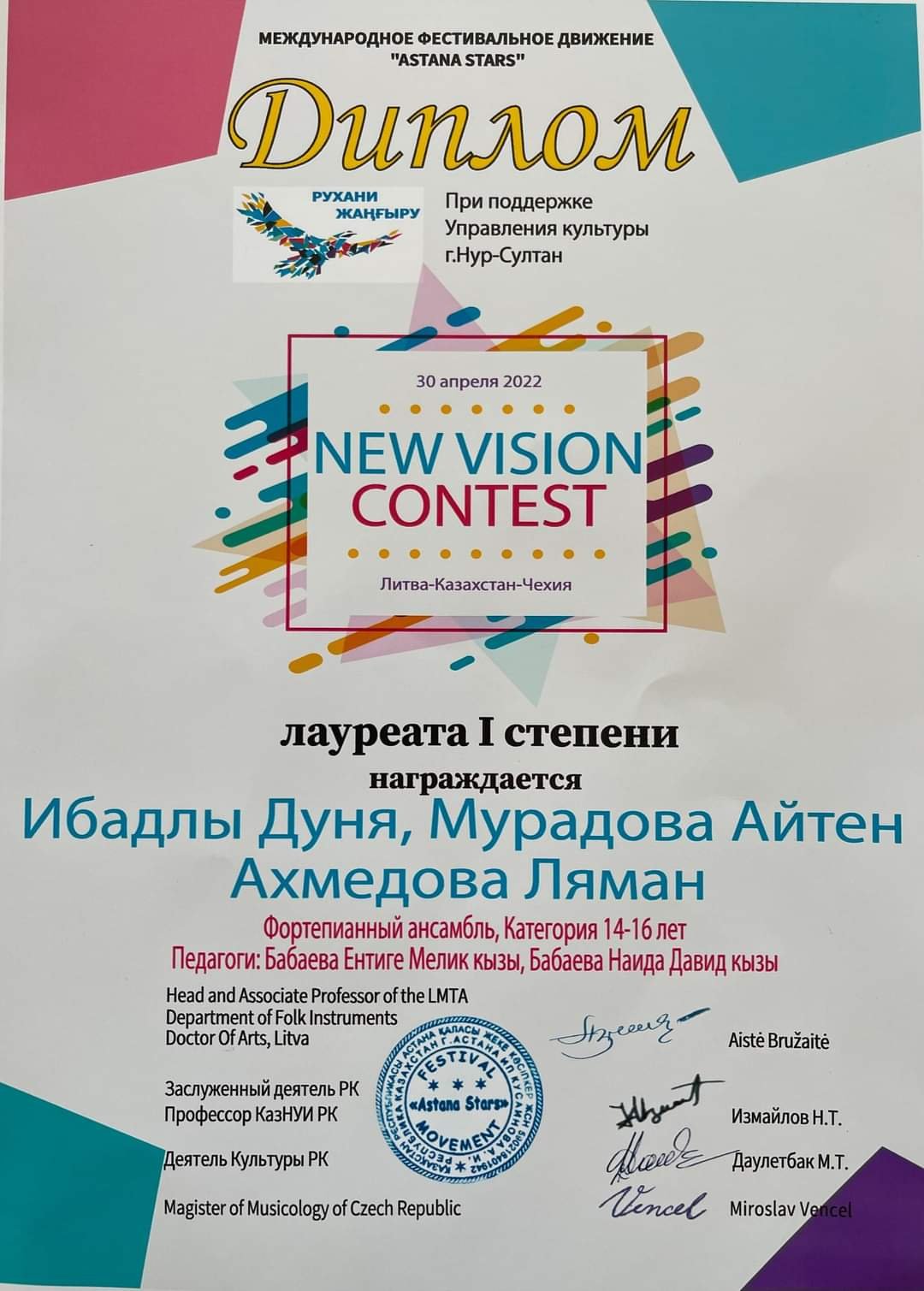 Sumqayıt Regional Mədəniyyət İdarəsinə tabe olan Ə.Bakıxanov adına 1 nömrəli uşaq incəsənət məktəbinin Fortepiano şöbəsinin şagirdləri Dünya İbadlı, Aytən Muradlı, Ləman Əhmədova Astanada keçirilən beynəlxalq "NEW VISION CONTEST" onlayn müsabiqəsinin ansambl nominasiyasında 1-ci dərəcəli diploma layiq görülüblər. Müəllimləri Əntiqə Babayeva və Naidə Babayeva şagirdlərinin uğurlu çıxışlarına görə təşəkkürnamə ilə təltif olunublar.